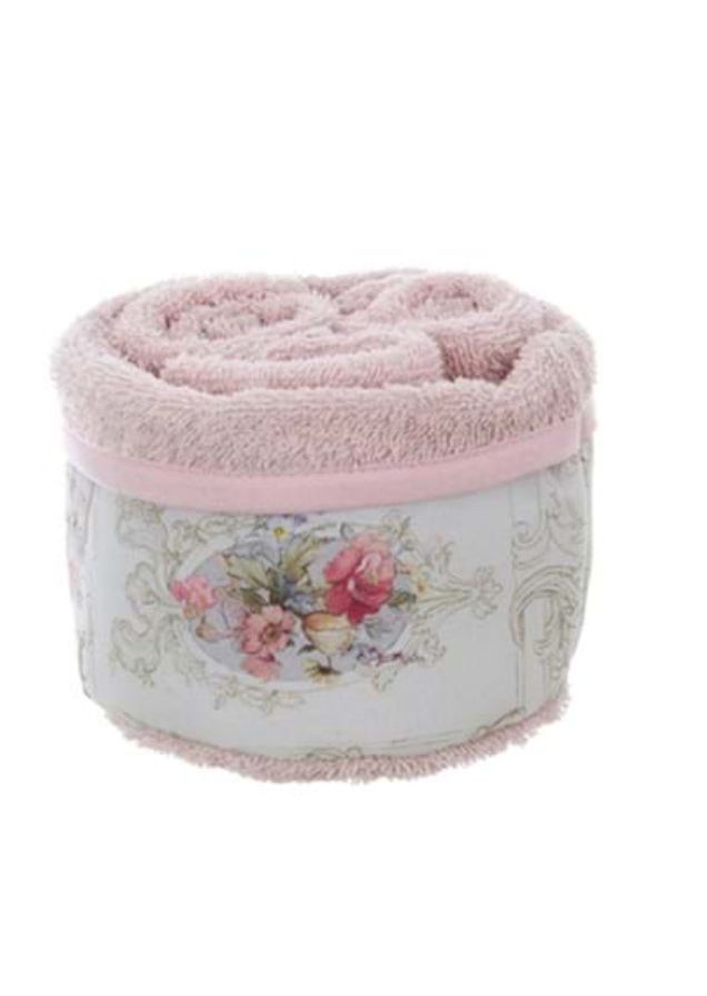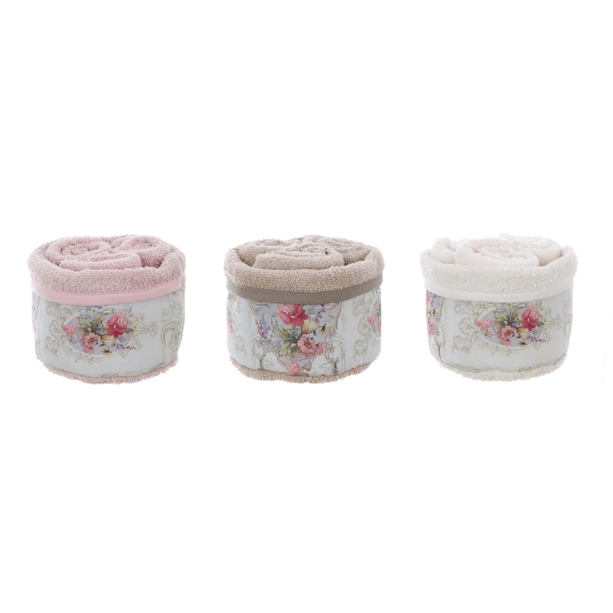Lavette Blanc Mariclò in morbida spugna con fascia decorativa floreale sul cestino. Eleganti e delicati, ideali per un bagno shabby chic. ideali per quando si hanno ospiti.