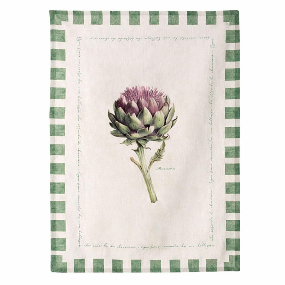 Meraviglioso strofinaccio Blanc Mariclò in cotone misto con stampa carciofo, stile country chic.
